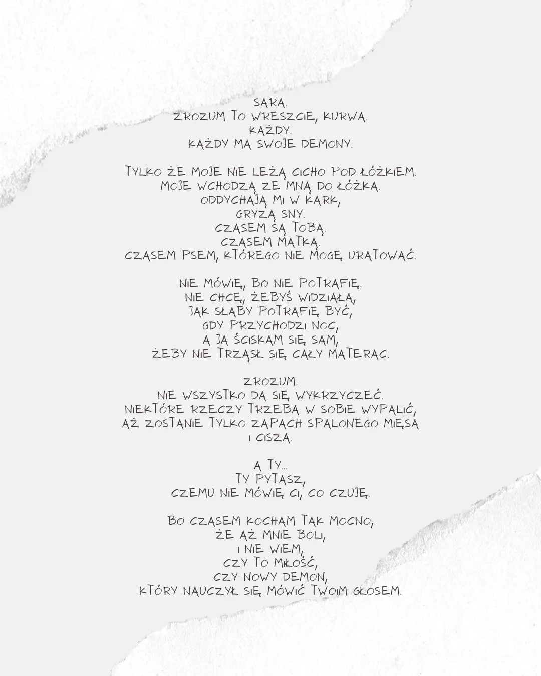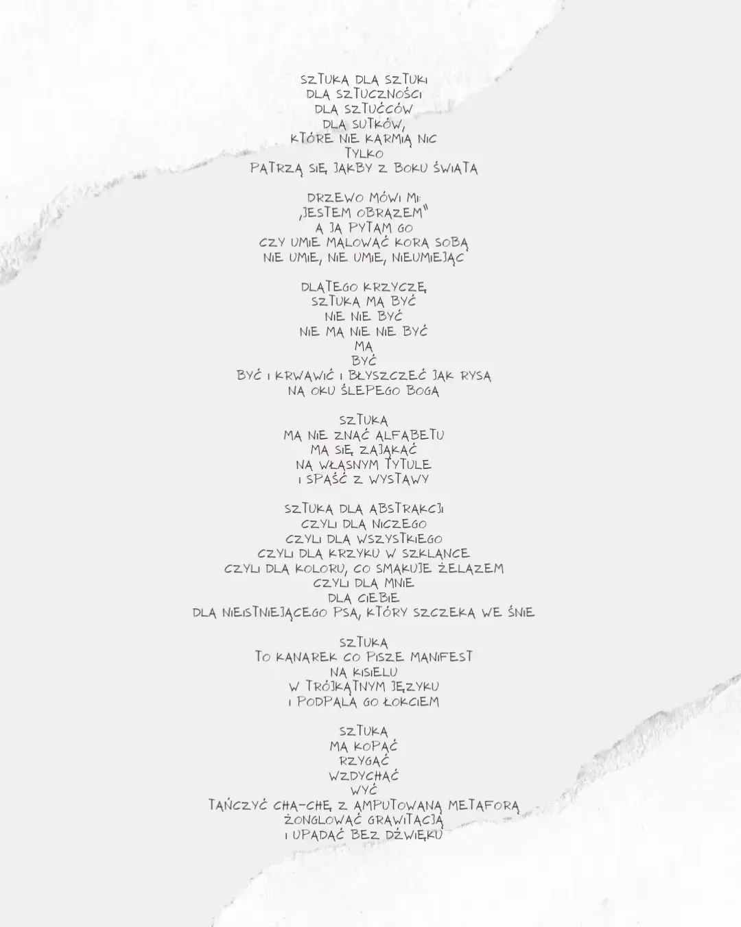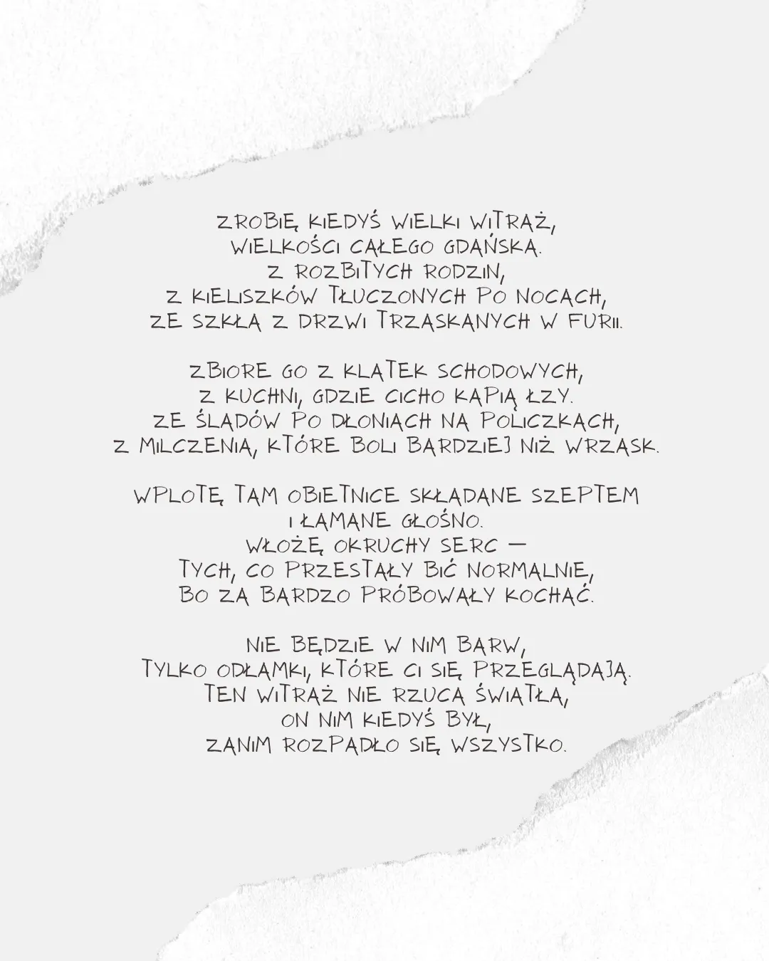 Ars longa, vita brevis Kobieta w oknie, co liczy przechodniów, wzdycha za mężem i stuka do modłów. W kredensie schowała łzy syna z frontu, i śmieje się cicho do radia z remontu. Chłopak, co w ruinach rozstawia koncerty, na pustych krzesłach zostawia aperty. Nie zna nut, lecz gra jakby znał światło, którego nie widać — ale pali się łatwo. Dziewczynka, co mówi, że Bóg to jest mur, co chroni przed krzykiem, co tłumi jej sznur. W kieszeni ma kamień, a w dłoni promyk, rysuje anioła na plecach komy. Starzec, co codziennie przestawia zegary, jakby mógł wycofać dawne koszmary. Szepcze do ściany — ona go zna, tylko ona nie zniknie, gdy zgaśnie za dnia. Matka z łyżeczką, co karmi powietrze, twierdzi, że dziecko „gdzieś jeszcze tu mieszka”. W kąciku pod stołem pieluszka i misie, i nikt nie ma serca, by powiedzieć: „już nic nie…” Mężczyzna, co śmieje się tylko o świcie, mówi, że wtedy go nie słyszy życie. Zjada opłatki z gazety i farby, wierzy, że wszystko wina propagandy. I znów ten chłopak — co siedzi najciszej, jakby w nim mieszkało coś, co nie słyszy. W kieszeni ma zegar, który nie tyka, bo czas go nie rusza — jest martwy od stycznia.
